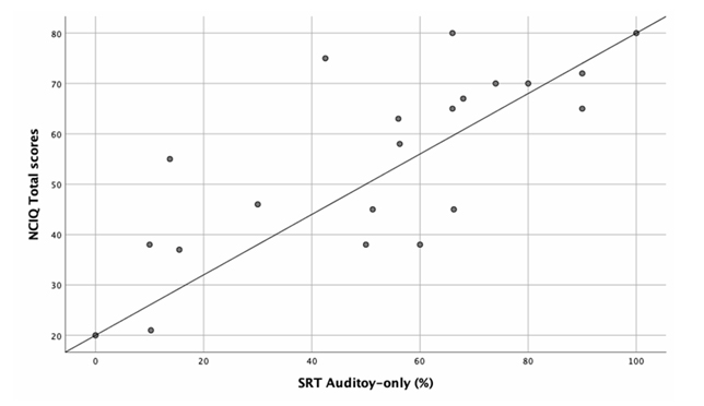 Figure 1: Correlation of auditory-only Sentence Recognition Scores with total NCIQ scores. |