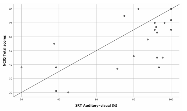Figure 2: Correlation of auditory-visual Sentence Recognition Scores with total NCIQ scores. |