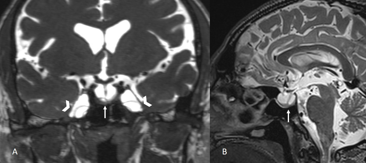 Figure 1: Coronal CISS image and sagittal T2-weighted SPACE image show empty sella (arrows) and enlargement of the Meckel's caves (arrowheads). |