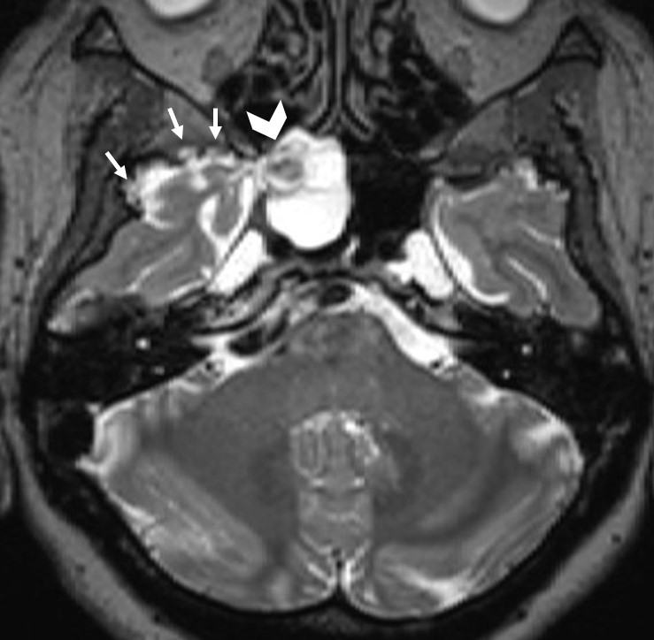 Figure 3: Axial T2-weighted SPACE image shows arachnoid pits (arrows) and encephalocele with CSF extending to the sphenoid sinus (arrowhead). |