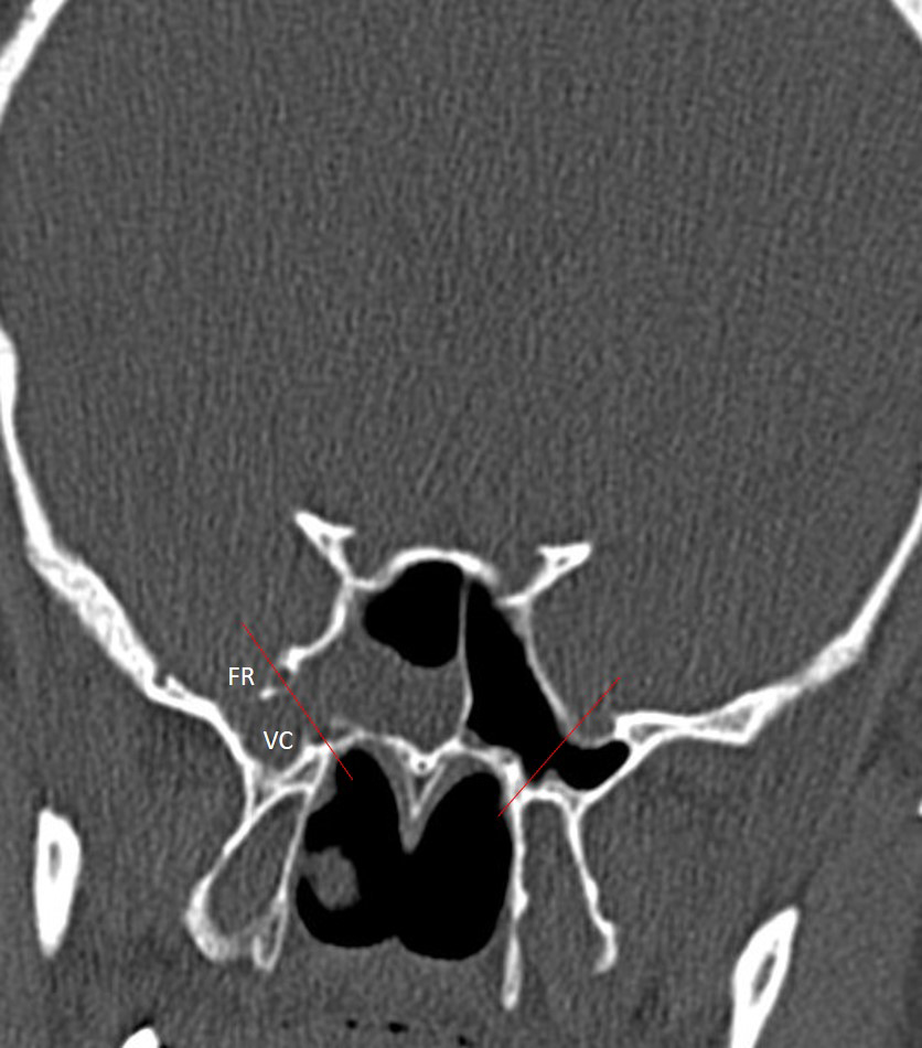Figure 4: Coronal CT image of the sphenoid sinus showing the anatomical landmarks used to define lateral recess pneumatization. Lateral recess pneumatization was defined as pneumatization lateral to the line connecting the foramen rotundum (FR) and the Vidian canal (VC). |