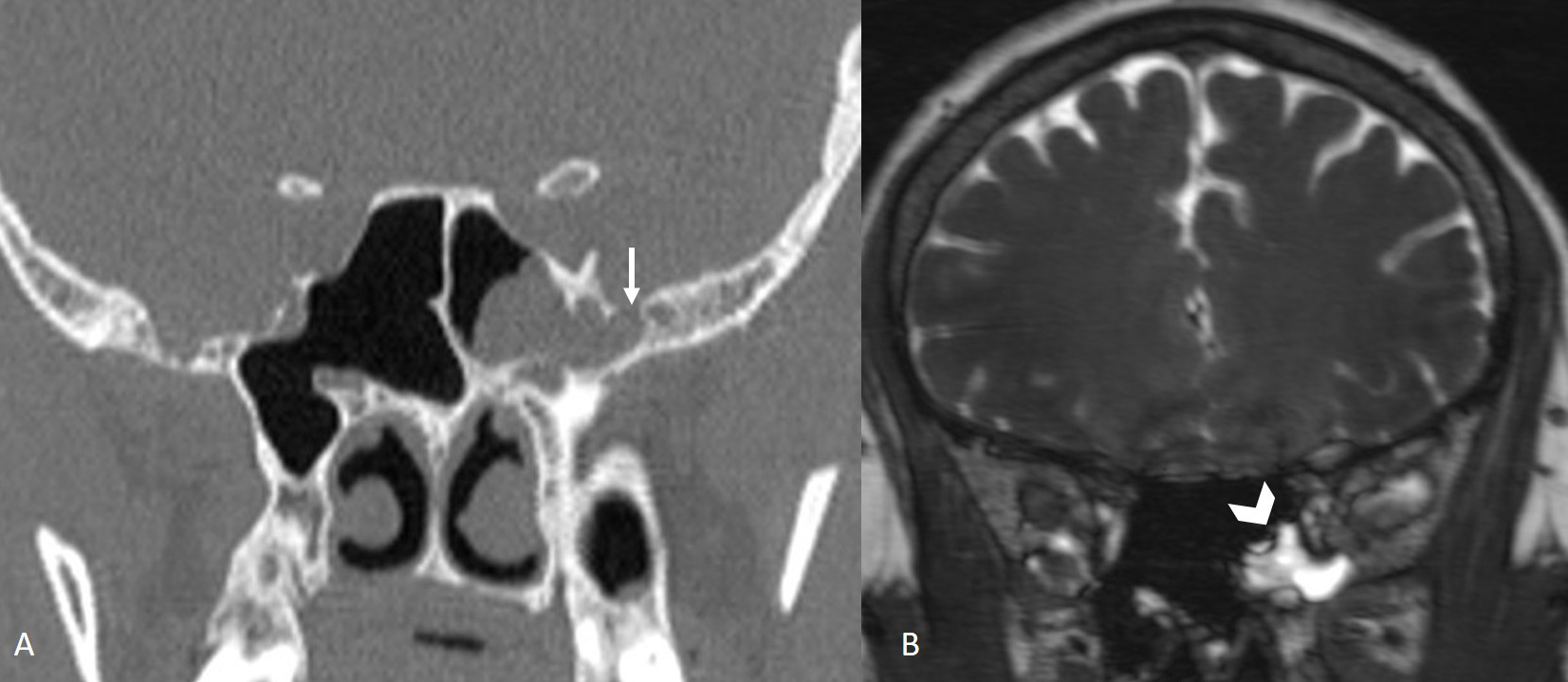 Figure 5: Coronal CT image (A) shows bony defect (arrow) in the left sphenoid sinus lateral wall and coronal CISS image (B) show CSF (arrowhead) in the left sphenoid sinus. |