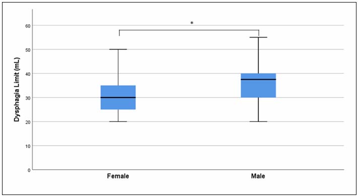 Objective: Dysphagia Limit (DL) is an electrophysiological assessment tool used in swallowing evaluations. The main objective of this study was to examine DL findings in healthy young adults aged 18-25 years.Material and Methods: A total of 100 individuals (50 males and 50 females) were included in the study. During DL measurements, each participant underwent swallowing trials using thin liquid in 5 mL increments (5, 10, 15, 20, 25, 30 mL, etc.), while submental surface electromyography (sEMG) recordings were simultaneously recorded. When a secondary swallow and/or aspiration sign was observed in the sEMG trace, the trial was terminated and the corresponding volume was recorded as the DL.