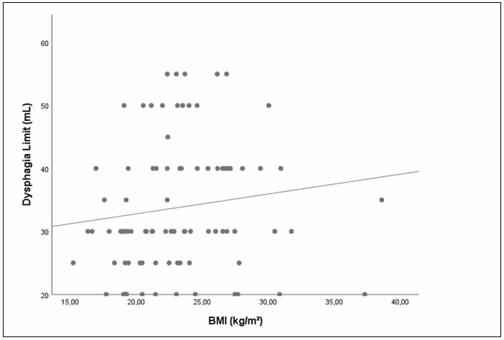 In the present study, the median DL value for healthy individuals aged 18-25 years was found to be 30 mL (min-max = 20-55), and the DL values were statistically significantly higher in males compared to females. Additionally, a weak but statistically significant positive correlation was observed between participants" BMI and DL findings.A review of the literature revealed that studies investigating DL findings in healthy individuals without any swallowing disorder are limited. In this context, in a study conducted by Ertekin et al.,[13] DL findings of 30 healthy individuals (20 males and 10 females) aged between 20 and 71 years (mean ± SD = 43.0 ± 17.6) were reported to range between 25 and 40 mL. Similarly, in another study by Ertekin et al.,[18] DL findings were examined in a total of 252 participants, including 75 healthy individuals and 177 patients diagnosed with neurogenic dysphagia. The healthy participants were divided into three age groups: young (17-39 years, N = 38, mean age = 27.8 years), middle-aged (40-59 years, N = 17, mean age = 50.2 years), and elderly (60-81 years, N = 20, mean age = 69.2 years). In all age groups, the DL volume was reported to be above 20 mL. In a study conducted by Selçuk et al.,[26] the effect of thin liquid (water) at different temperatures on swallowing physiology was investigated using the DL method. Among 40 healthy participants (23 males and 17 females) with a mean ± SD age of 47.9 ± 15.6 years, DL values were found to be above 20 mL in all individuals, with an average DL of 30.5 ± 7.8 mL for water at room temperature. Consistent with previous findings, the present study also found that DL volumes were above 20 mL in all participants; however, the maximum DL volume reached up to 55 mL. The reason for the DL volume reaching up to the level of 55 mL might be that our study was conducted with a younger population compared to previous studies. It is known that with increasing age, coordination of the swallowing reflex, swallowing capacity, and the volume/thickness of swallowing muscles tend to decrease.[27,28] This could explain the higher DL volumes found in the young adult population examined in this study. Moreover, previous studies did not provide any mean or median DL values specific to a defined age group (18-25 years), making direct comparisons difficult. Additionally, technical differences exist between studies regarding the sEMG equipment used for DL measurement. Therefore, although this study provides specific normative DL values for young adults, the results should be interpreted with caution.
